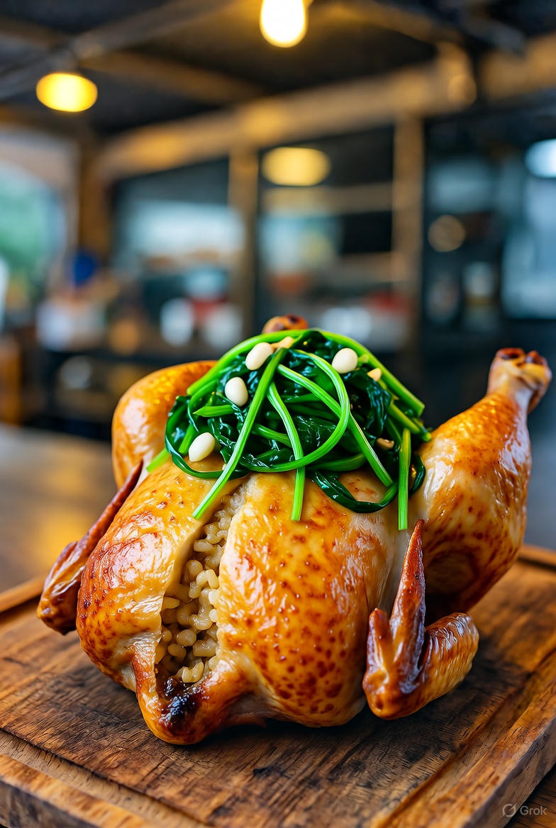 - 4. 찹쌀밥 채우기: 통닭의 뱃속에는 대개 찹쌀을 주재료로 한 밥이 채워져 나옵니다. 닭이 익는 동안 이 찹쌀밥은 닭의 육즙과 훈연 향을 흡수하여 마치 특급 영양밥처럼 변신합니다.