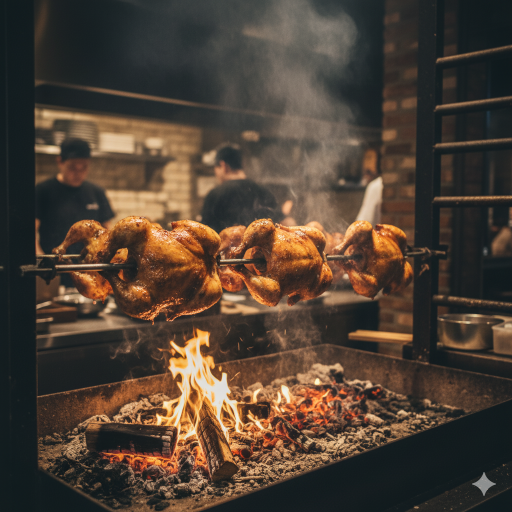- 2. 참나무 장작 훈연: 숙성된 닭은 대형 가마에 넣고 잘 건조된 참나무 장작으로 천천히 구워집니다. 이 과정은 일반 오븐이나 숯불구이와 다릅니다. 참나무의 깊은 향이 닭고기에 서서히 스며들어 훈연의 구수한 맛을 더합니다.
