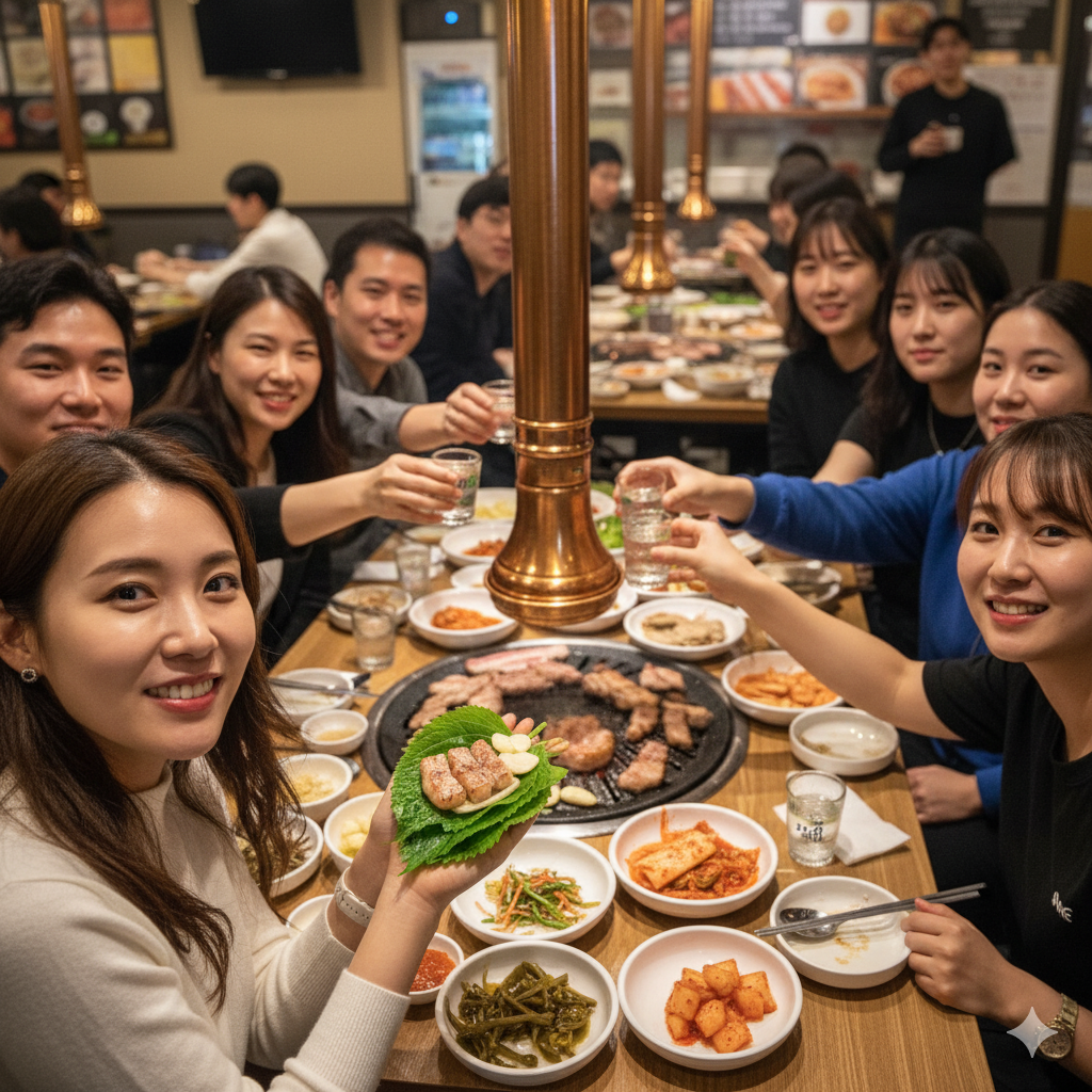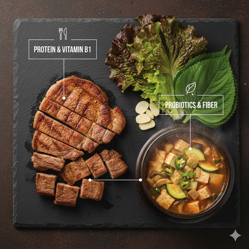 1. 돼지고기 (근고기/돈차돌): 풍부한 비타민 B1 (티아민)은 피로 해소와 활력 증진에 필수적입니다. 숙성 과정에서 단백질이 아미노산으로 분해되어 소화 흡수가 더욱 용이해집니다. 2. 한우 차돌박이: 철분과 비타민 B12가 풍부하여 빈혈 예방과 에너지 생성에 도움을 줍니다. 지방질은 불포화지방산 비율이 높아 적절히 섭취하면 좋습니다. 3. 된장찌개 (발효 식품): 콩의 사포닌, 이소플라본, 그리고 유익균(프로바이오틱스)이 풍부합니다. 고기를 먹은 후 구수한 된장찌개는 소화를 돕고 영양 밸런스를 맞춰줍니다. 4. 쌈 채소 & 마늘: 셀프바의 채소들은 비타민, 미네랄, 식이섬유가 풍부하여 고기의 소화를 돕고, 콜레스테롤 흡수를 억제하는 데 도움을 줍니다. 마늘의 알리신 성분은 살균 작용과 면역력 증진에 탁월합니다.