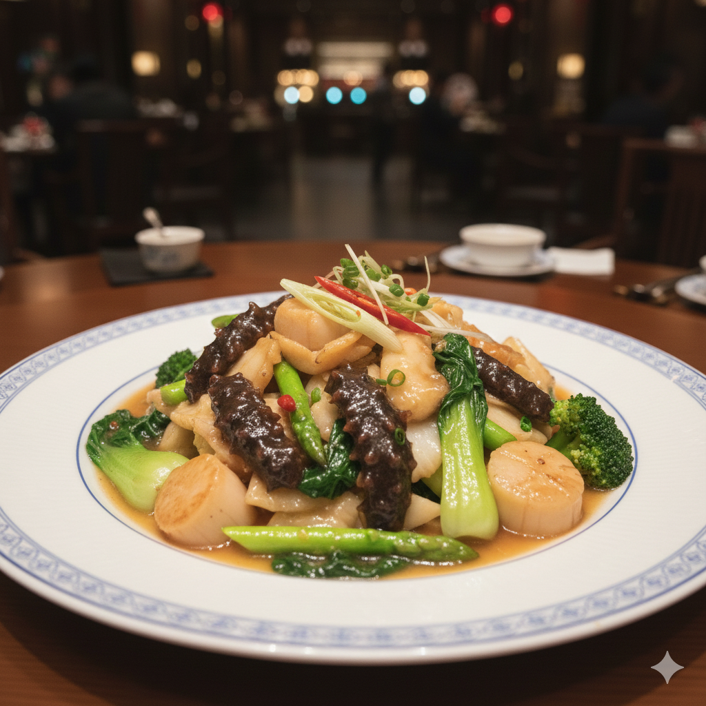 고급 코스의 품격을 보여주는 해산물 요리입니다. 귀한 해삼, 전복, 관자 등 바다의 보물들을 셰프의 고화력 웍 기술로 빠르게 볶아냅니다. 재료 본연의 탱글탱글한 식감이 살아있으며, 자극적이지 않은 맑은 소스가 깊은 감칠맛을 더해 원기 회복에 최고입니다.